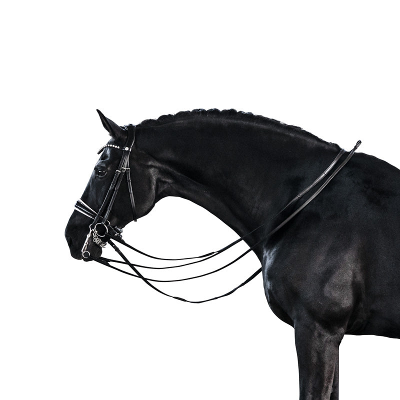 The double bridle, also known as a Weymouth bridle, is an advanced piece of tack used in dressage to refine communication between rider and horse.