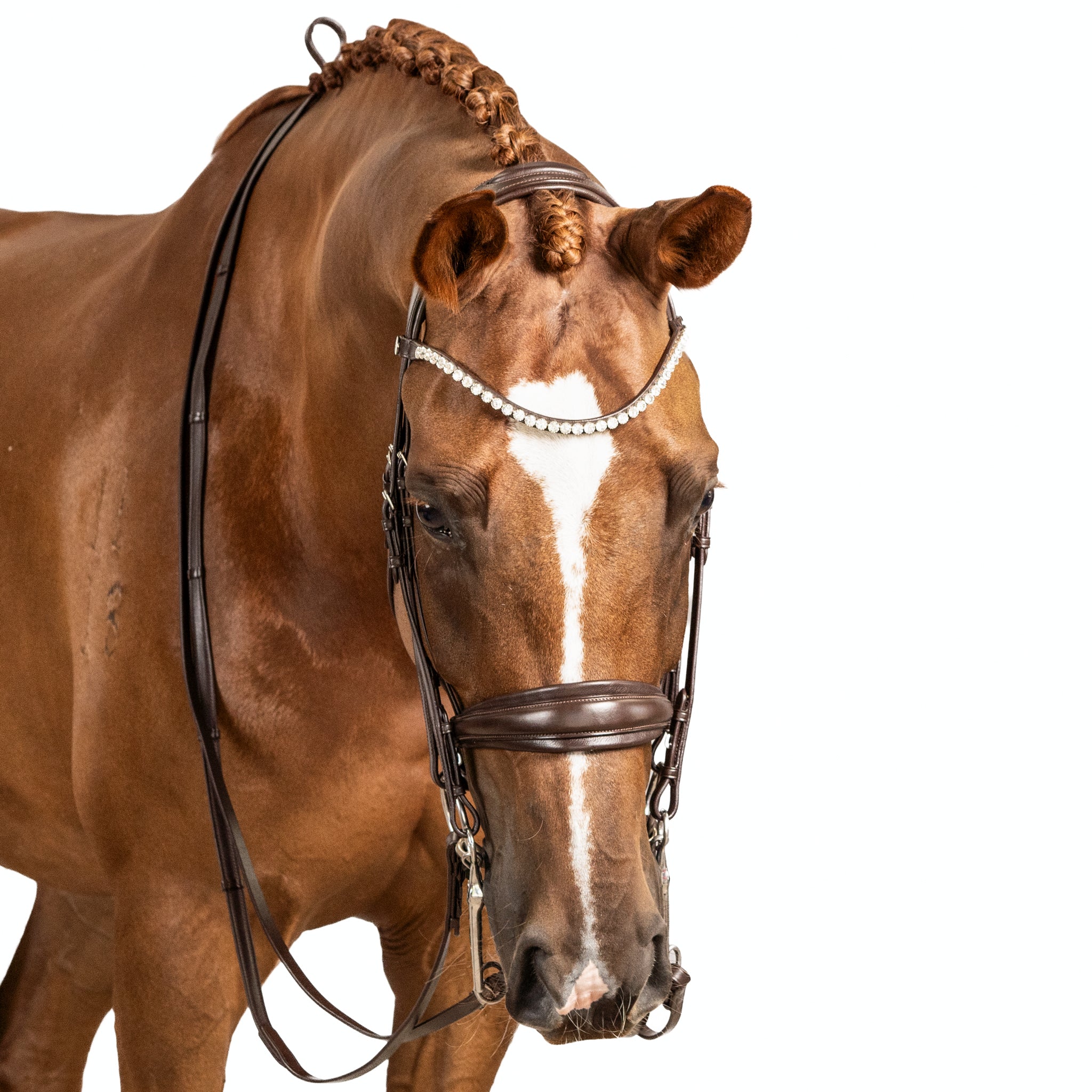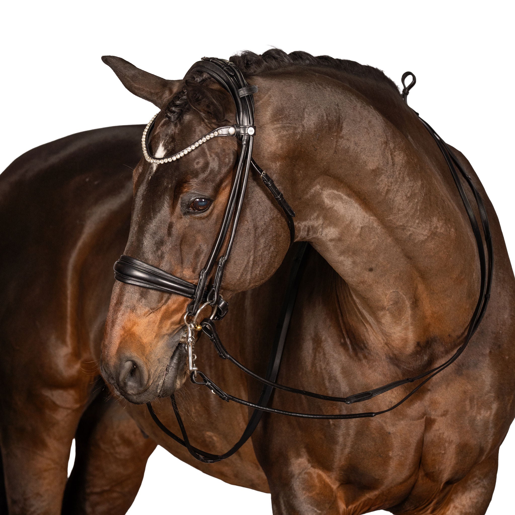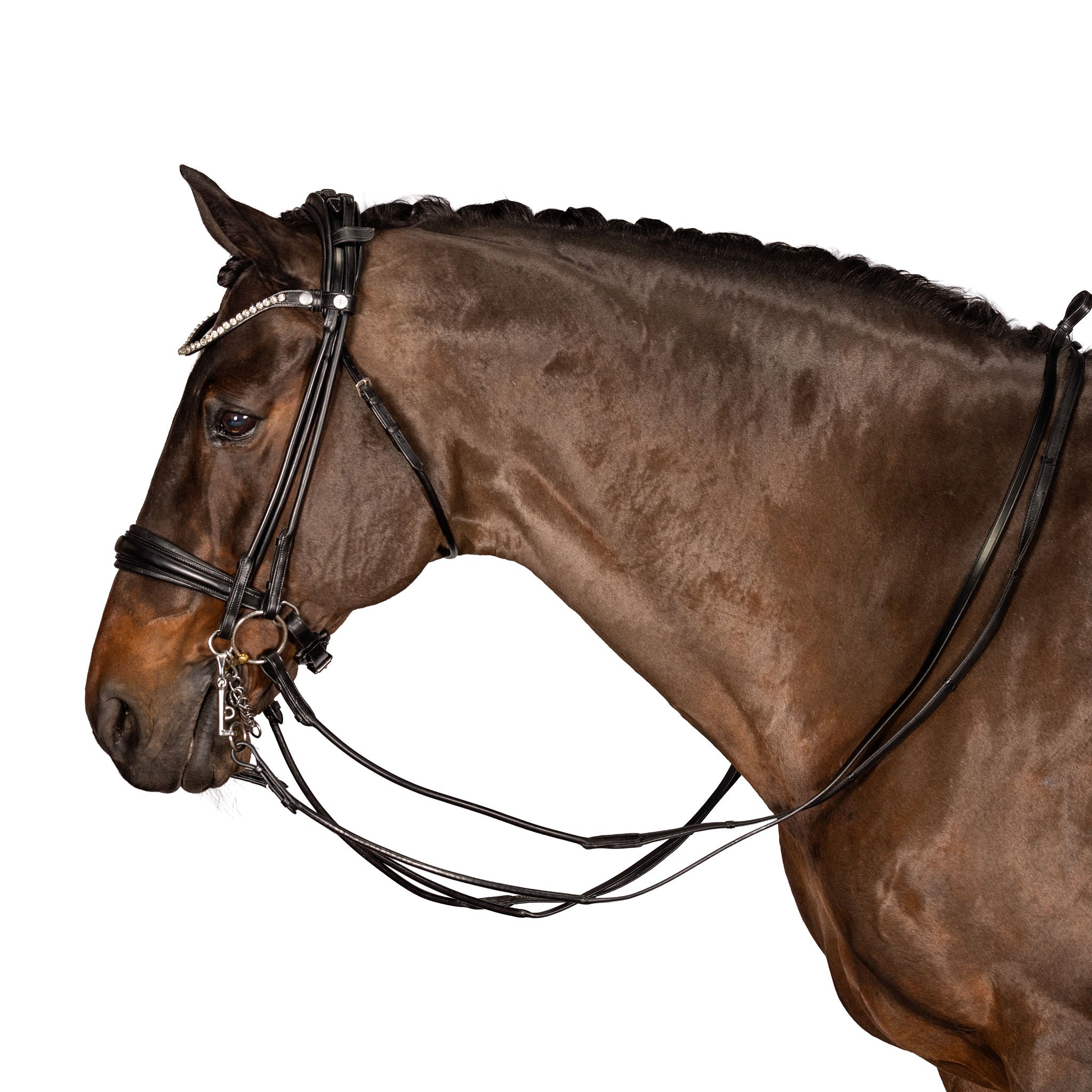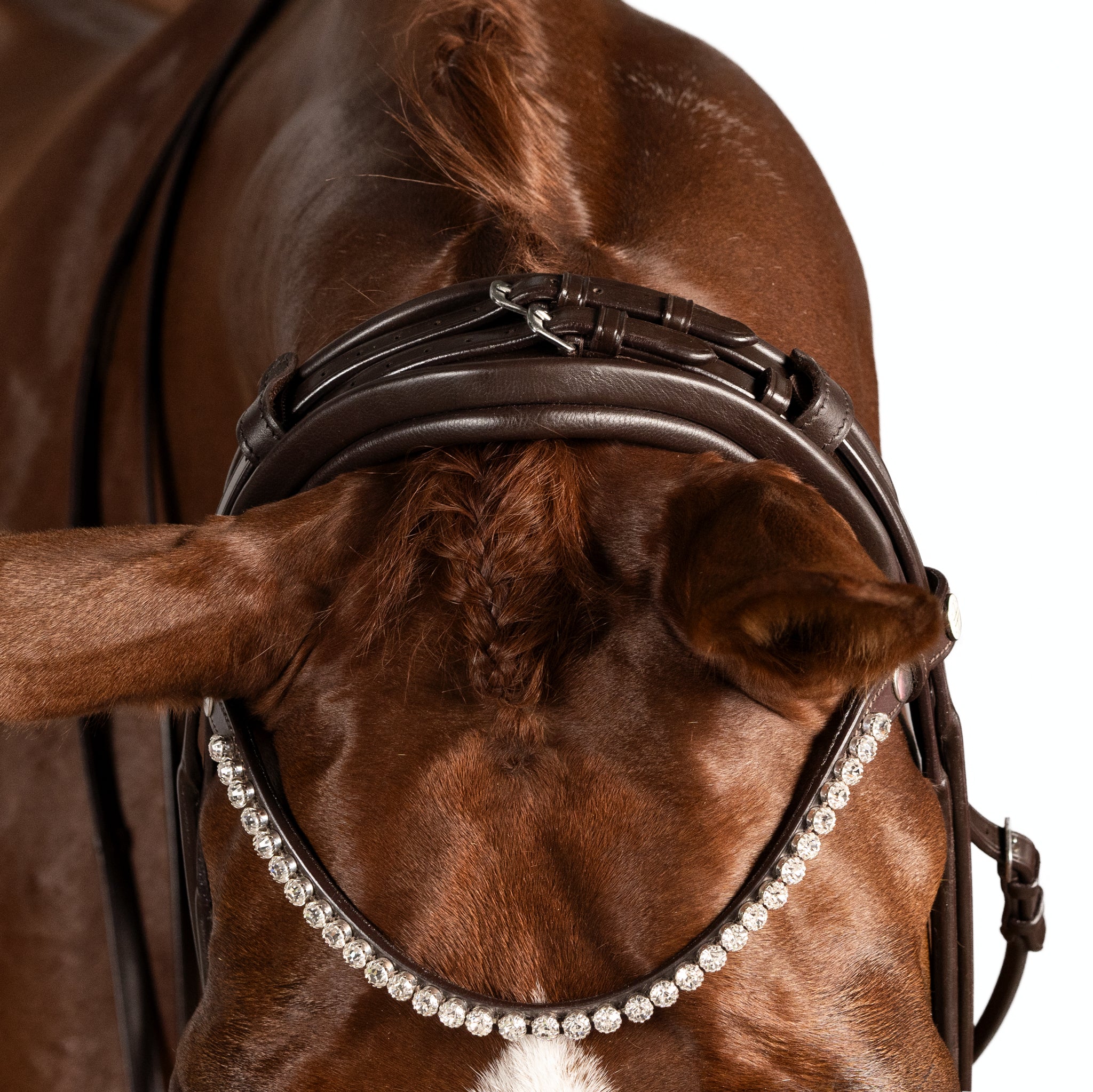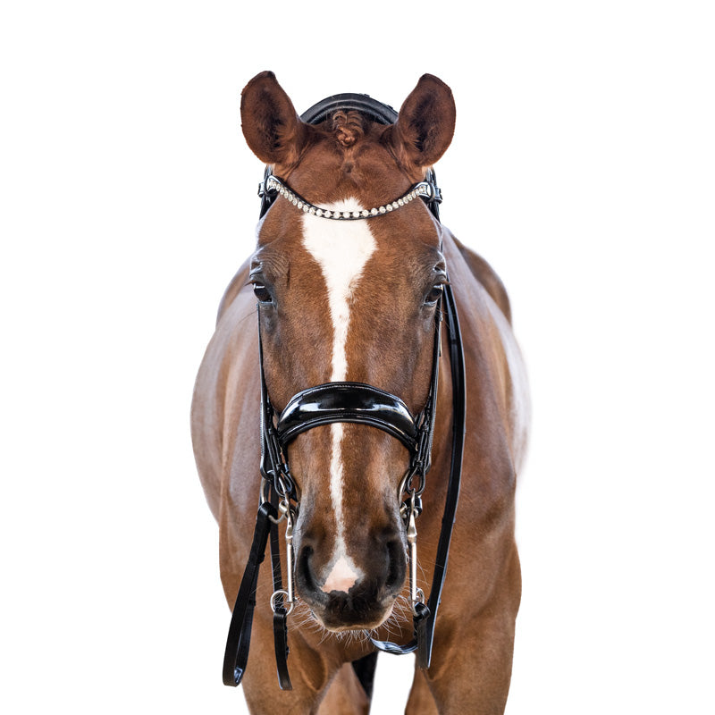Brow band and Cheek piece Adjustments: Ensure that the brow band is wide enough to fit comfortably behind the horse's ears without pressing on them. It should provide sufficient space for the bridle and bits to rest without causing discomfort. Adjust the cheek pieces so that the bridle sits snugly, yet comfortably, on the horse's head without exerting excessive pressure on the sensitive facial structures.