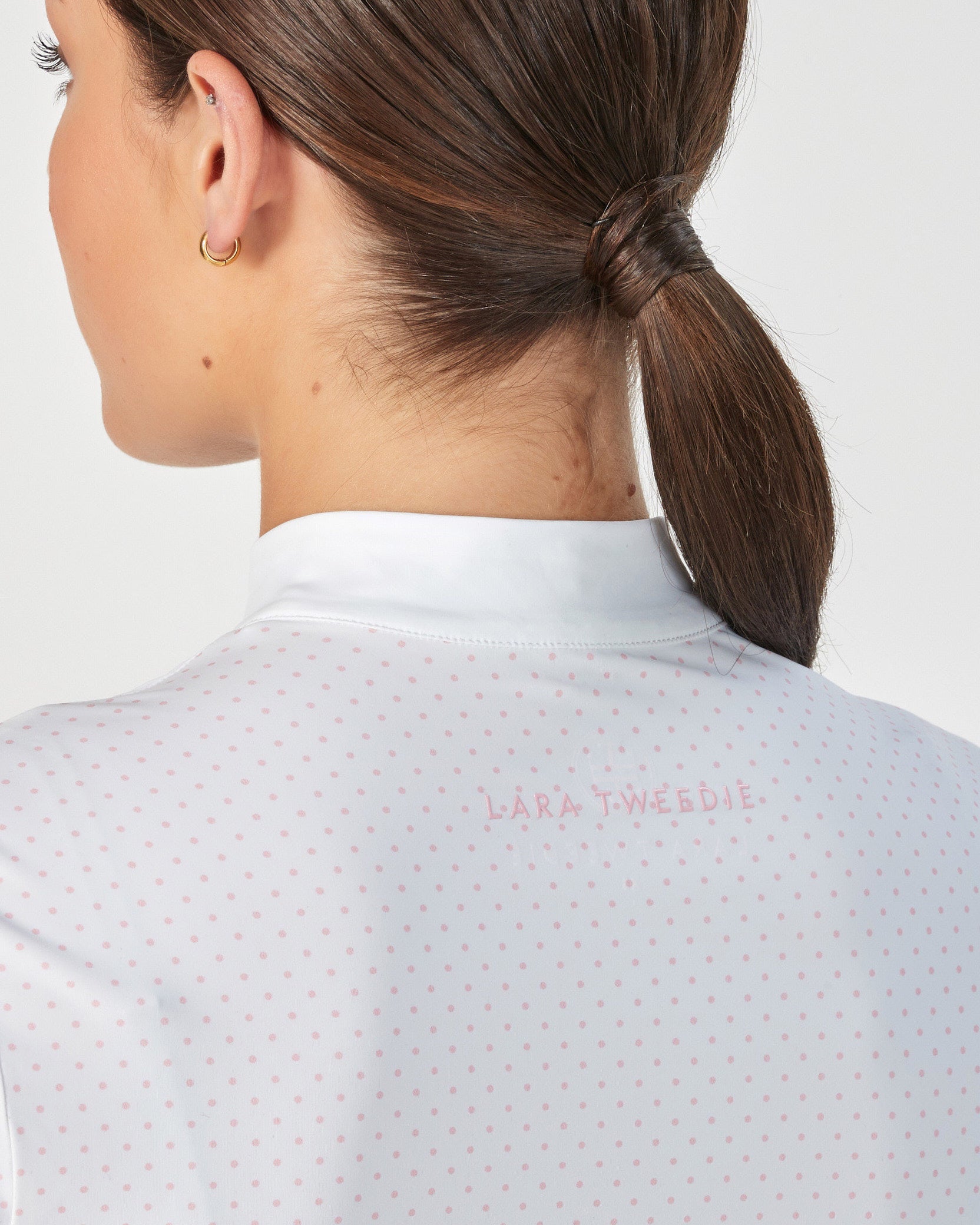 Details: White & pink LT logo badge, Lara Tweedie pink logo on back neck.
