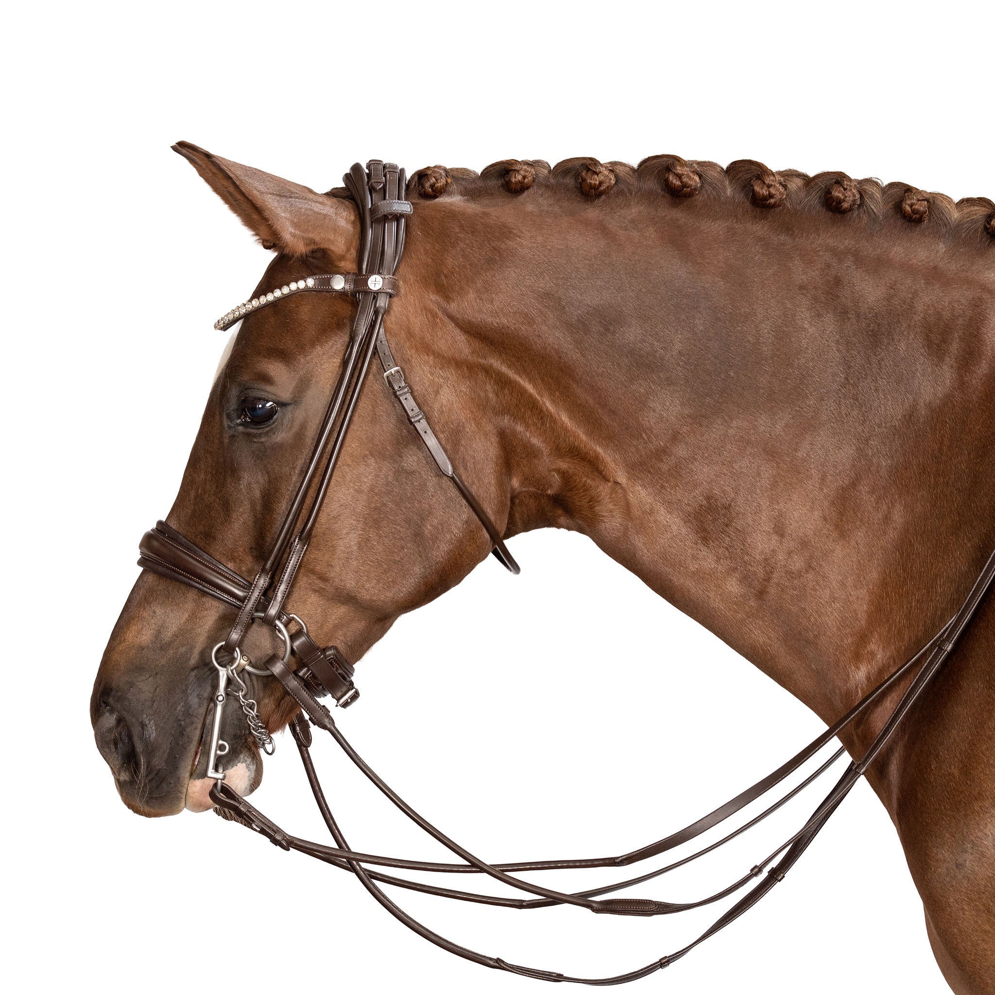 We chose our super popular tapered noseband for this bridle and finished the noseband with rounded dee rings and a slim line crank pad. The streamlined noseband ensures the cheek pieces maintain close contact with the face at they connect to the bit. The noseband on the double bridle is attached to the crown piece with a billet so there are no buckles in contact with the horses face.
